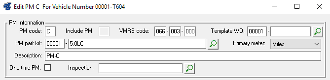 Part kits can be set in vehicle PM records (MVM, PM Schedule sub-window). When a work order line is added for a PM service, the part kit number will be displayed. A parts pick list can be printed with the Shop, Mechanic Copy and Time Stamp work orders so mechanics can quickly determine exactly which parts are needed to complete the PM. When posting parts to work orders, the assigned PM part kit number is displayed on the screen for reference. Then, rather than individually posting each part used, the part kit can be posted and all the components in the part kit will be posted to the work order. The parts inventory will be decremented and the costs posted to the vehicle.
