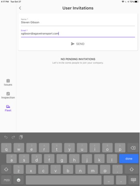 This is done by navigating to the Fleet Menu, click “Users”, then the "+" button in the toolbar. The User Invitations screen appears and you can invite users by entering their name and email.
