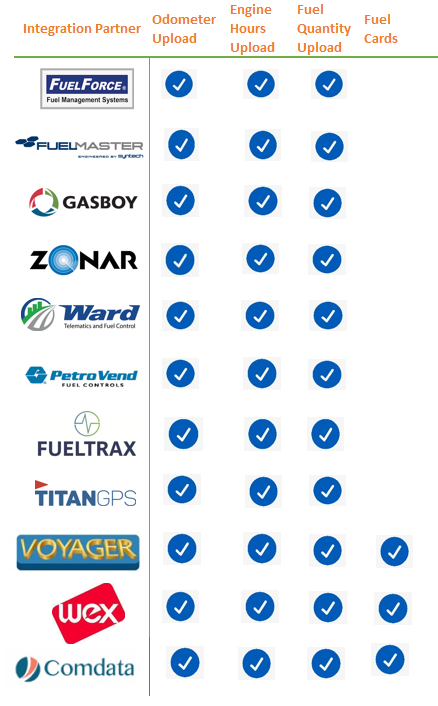 Fuel Partners offer fuel management systems to provide fleet-wide control and actionable data to help lower operational costs. For details on setting up an Electronic Fueling Interface (EFI), please see Electronic Fueling Interface. Generally, if you can get a csv with fuel data, we can use it.