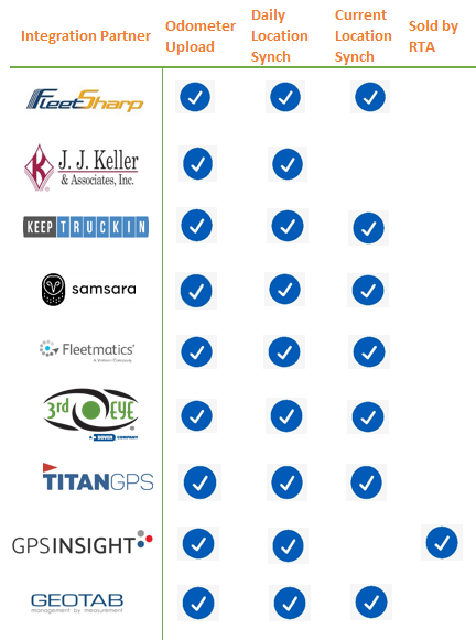 Telematics and Location partners provide information on odometer readings, fleet location, driver behaviors and diagnostic trouble codes and alerts. For additional details on RTA Telematics Integrations, please see Telematics Integrations