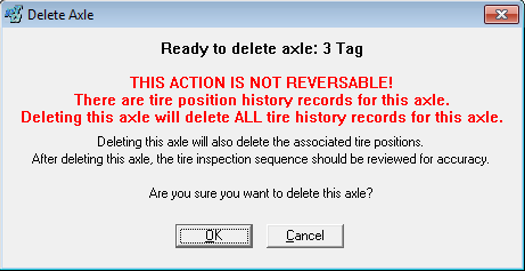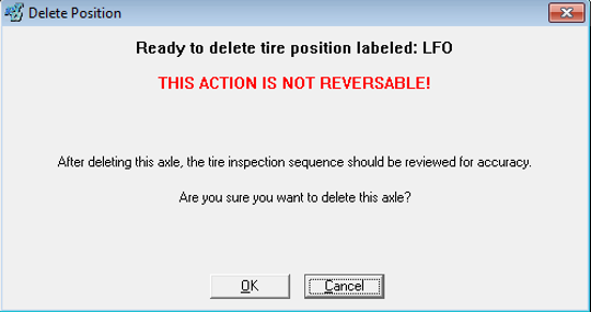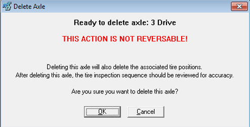 This is to warn you that by selecting OK, the deletion is an immediate action, deletes the axle and all current positions, and to check the Inspection Sequence after the deletion is complete.We now have only 6 tire positions after starting out with 10 because we deleted axle #3 and its 4 tire positions.