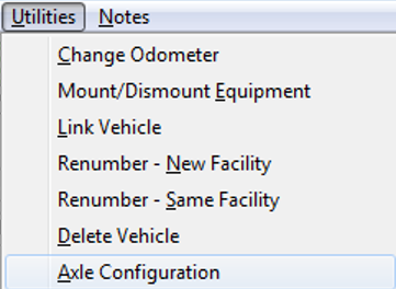 From the Vehicle Master Screen (MVM) top Menu Options bar, select Utilities>>Axle configuration (UA)