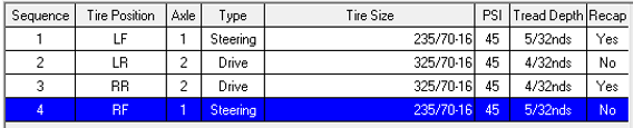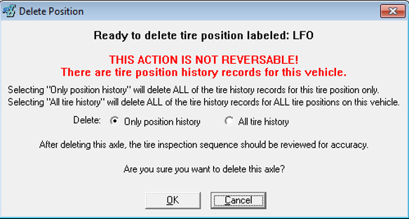 Note: If a vehicle has TD/PSI readings and you delete an axle or tire position, ALL history of TD/PSI readings for that Axle or tire position will be deleted from the Tire History Report (MVT) as well.