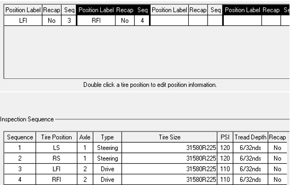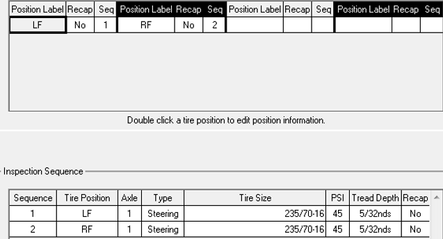 After entering axles and tire positions the Axle/Tire Configuration screen will now show editable position information in the middle of the screen and Inspection Sequence on bottom.