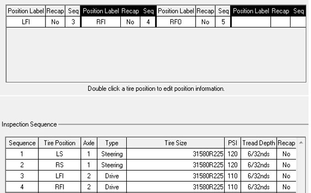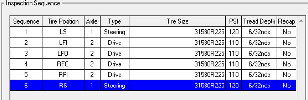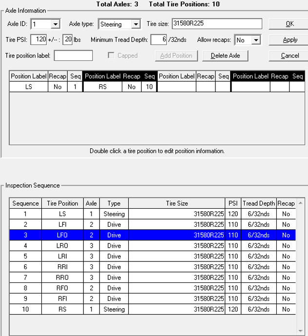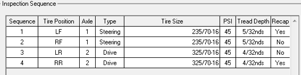 In the example below, the “Inspection Sequence” shows that there are 3 axles and 10 tire positions. This is because a Peterbuilt was used as a template for a Toyota Prerunner.