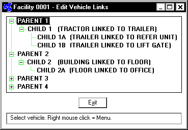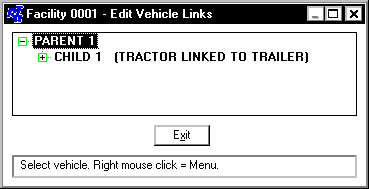 - When the Edit Vehicle Links window is first brought up, the list only displays level 1 parent vehicles and unlinked vehicles. To expand the list, click the symbol or double-click the parent vehicle number and the linked units will display. Place the mouse pointer on the unit to link, click the right mouse button, and choose Add Link.