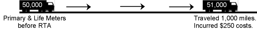 - Base Miles: This is the number of Life miles the vehicle traveled prior to being tracked in the RTA system. This number doesn't change when meters are updated and/or adjusted. It's subtracted from the Life miles to ensure vehicle lifetime costs are properly reported. For example, suppose a vehicle had 50,000 miles on it before you started tracking it in RTA. After the first month, the vehicle travels 1,000 miles and incurs $250 in fuel and maintenance costs.