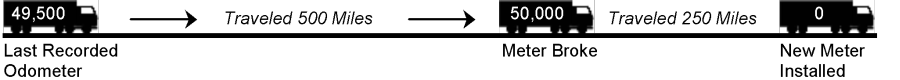 In this example, we will replace a meter that broke at 50,000 miles. While the meter was broken, the vehicle traveled 250 miles. A new meter was later installed.