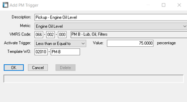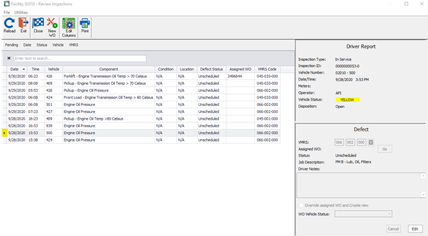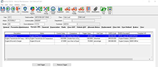 When a trigger falls into the Trigger Zone (drops below allotted percentage, raises above allotted temperature, etc.), a new Driver Report is created as a notice line utilizing the attached VMRS code and WO Template.