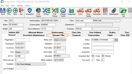 Within the Vehicle Master Screen (Master > Vehicle > File Maintenance) you will see a new Tab called “Dynamic PMs”