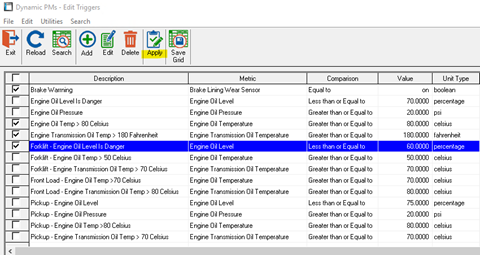 Once you have added the desired triggers to your master list at Master > Vehicles > Dynamic PM Triggers, you can select the applicable triggers to apply with the check-box feature and select “Apply” button at the top.