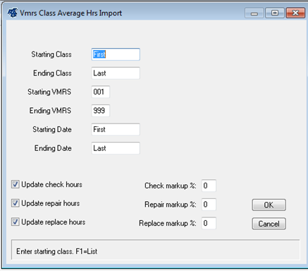 This procedure prompts for a range of Class Codes, VMRS codes and dates to select. The average time recorded for each VMRS job code for each vehicle class will be calculated.