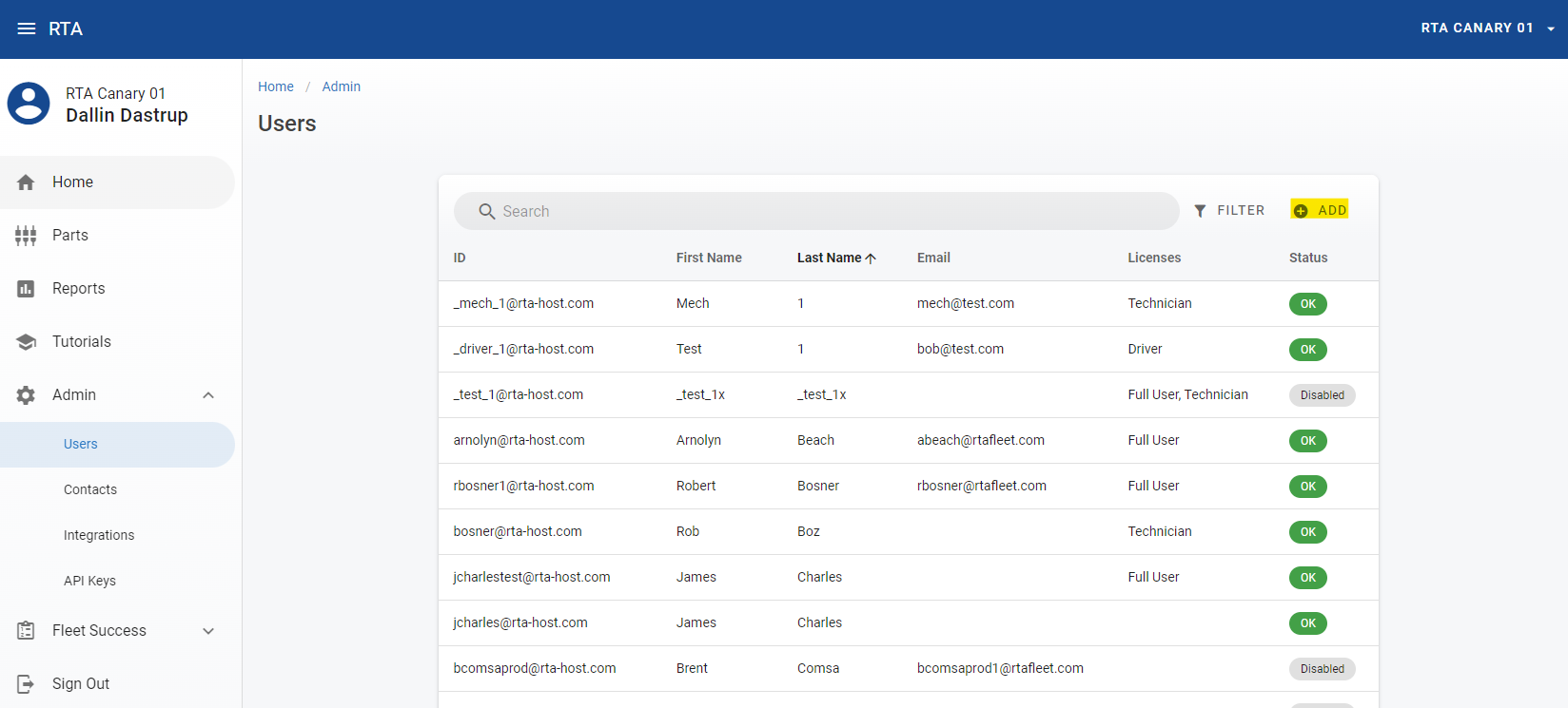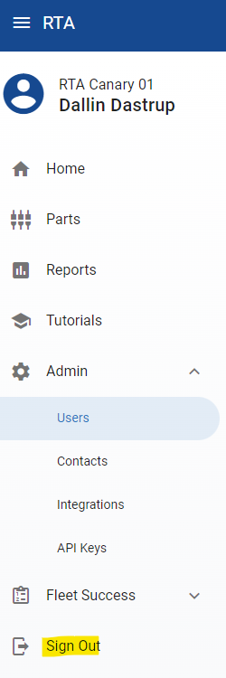 B. Once in the RTA Web app, the Admin will be able to start adding users. As pictured in Figure 3, first select {{Admin}} from the left-hand menu. From the drop-down, select {{Users}}