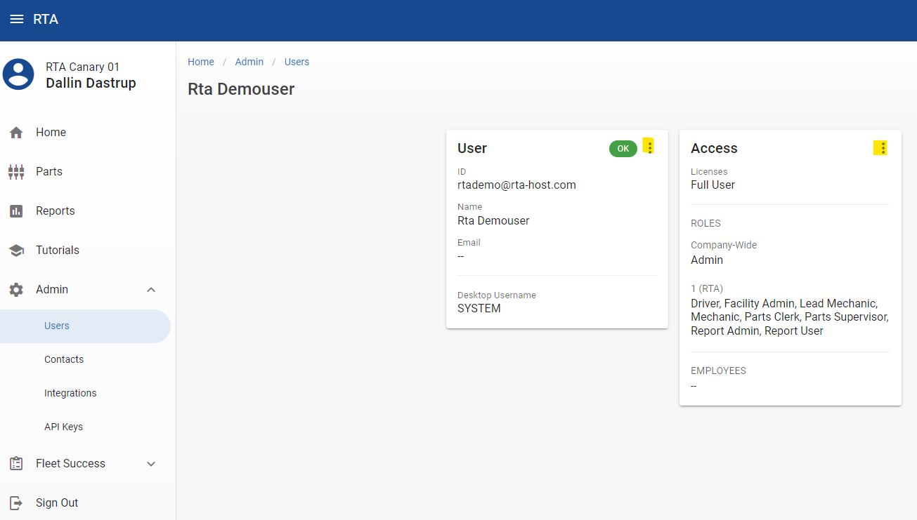 11. After adding the user info and hitting save, Admins need to assign roles and must assign a license. When you go to the 3-dot menu for "Access," it will show you how many license slots you have available. If you have unlimited users, it will also display that.The assigned role determines the user’s permissions. For example, the roles of Manager, Mechanic, Data Clerk, Parts Clerk, Driver, etc., all have varying levels of access. Roles can be applied to a user either globally or individually, per facility. To see examples of how users can be set up with different roles, you can click here