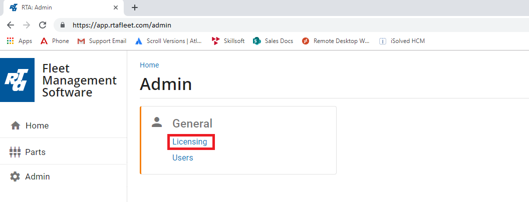 With our Hosted Subscriptions, you can either go with unlimited vehicle or unlimited users. For those who have unlimited vehicles and need to track their users and available licenses, we have a new way to track that. This is done through the admin website at http://app.rtafleet.com. After you sign in, you will want to hit the button for admin. Once you do, you will see the page below. You can see we added a link for "Licensing."
