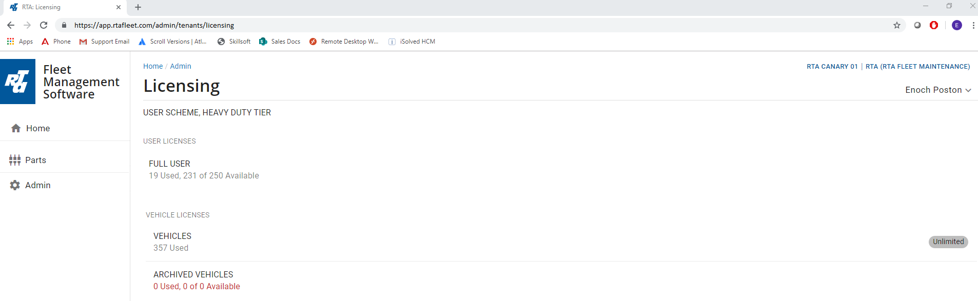 To view a list of the active user licenses in your subscription, log on to app.ratfleet.com com and click Admin | General | Licensing.