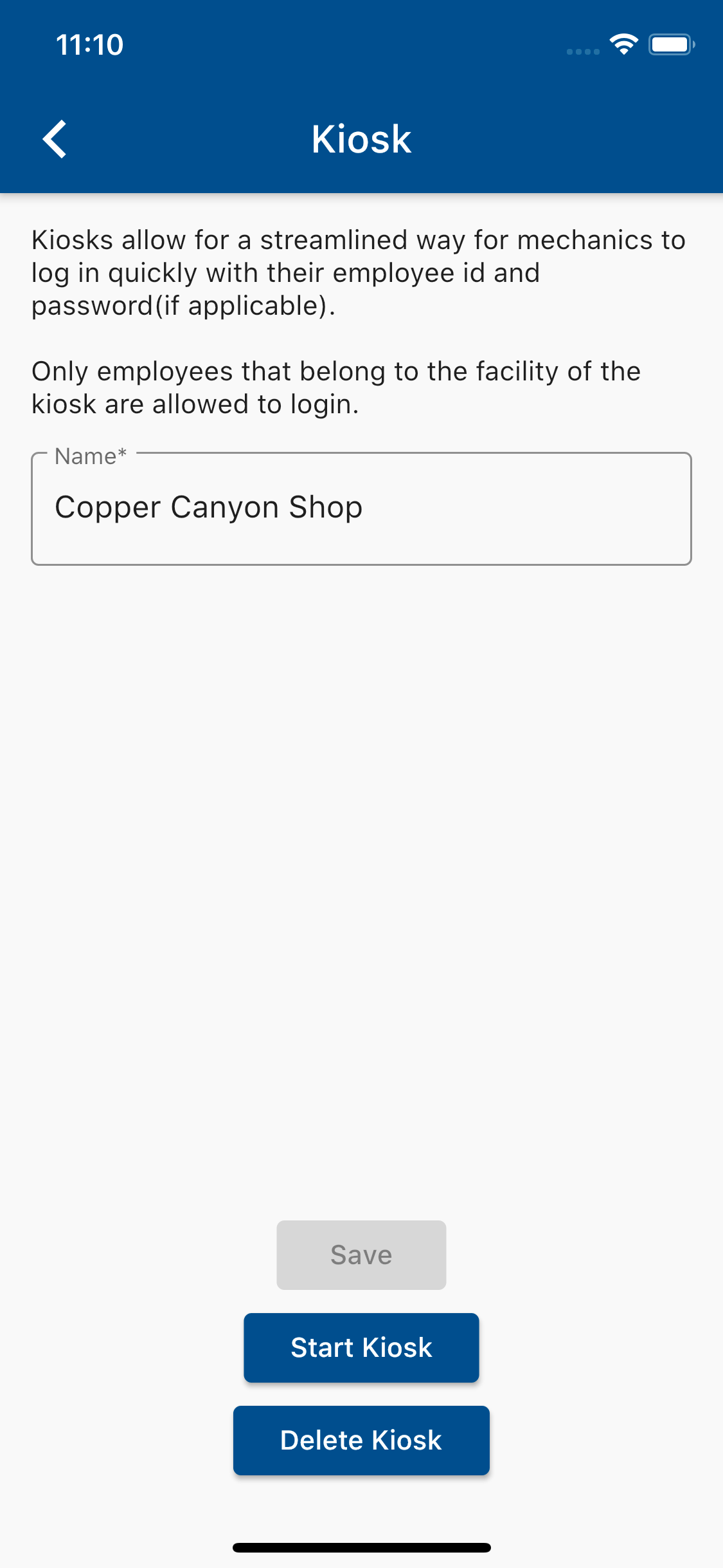 Mobile Kiosk allows for a streamlined way of allowing employees to login via their RTA Employee numbers and passwords, rather than their RTA Web App Credentials(i.e. ron.turley@rta-host.com). Kiosk Mode enables technicians to easily just tap their name, give their password, and log in!