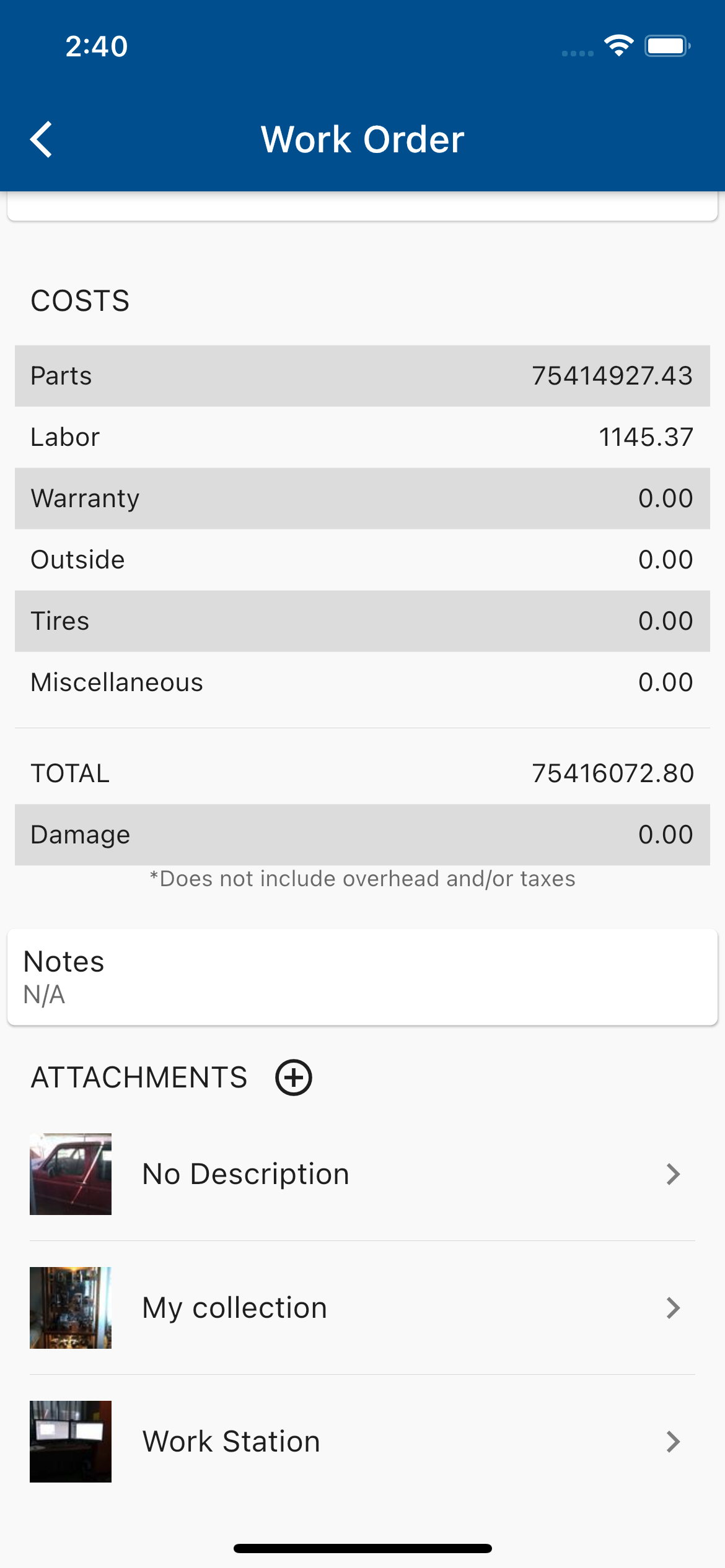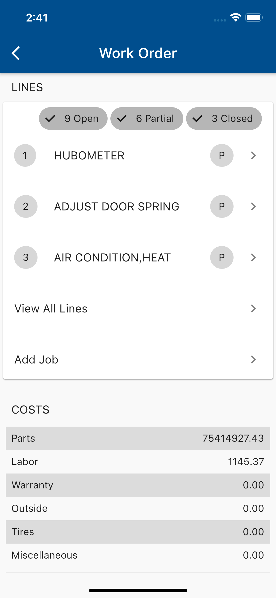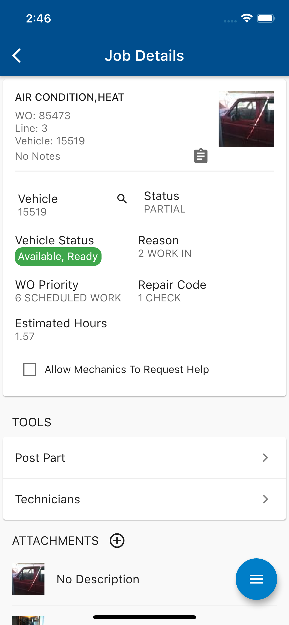 The Job Details screen is the home screen of a job. From here, a user can post parts, perform inspections, assign technicians to the job, and add another job.