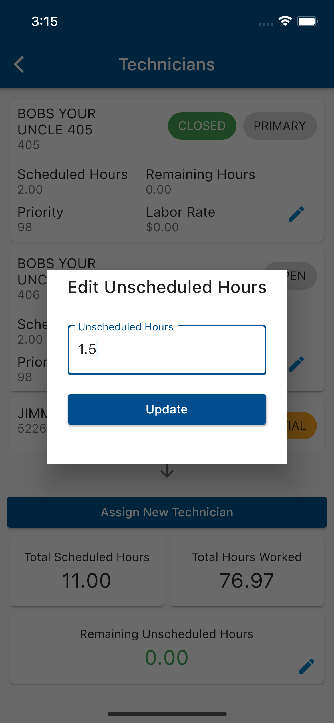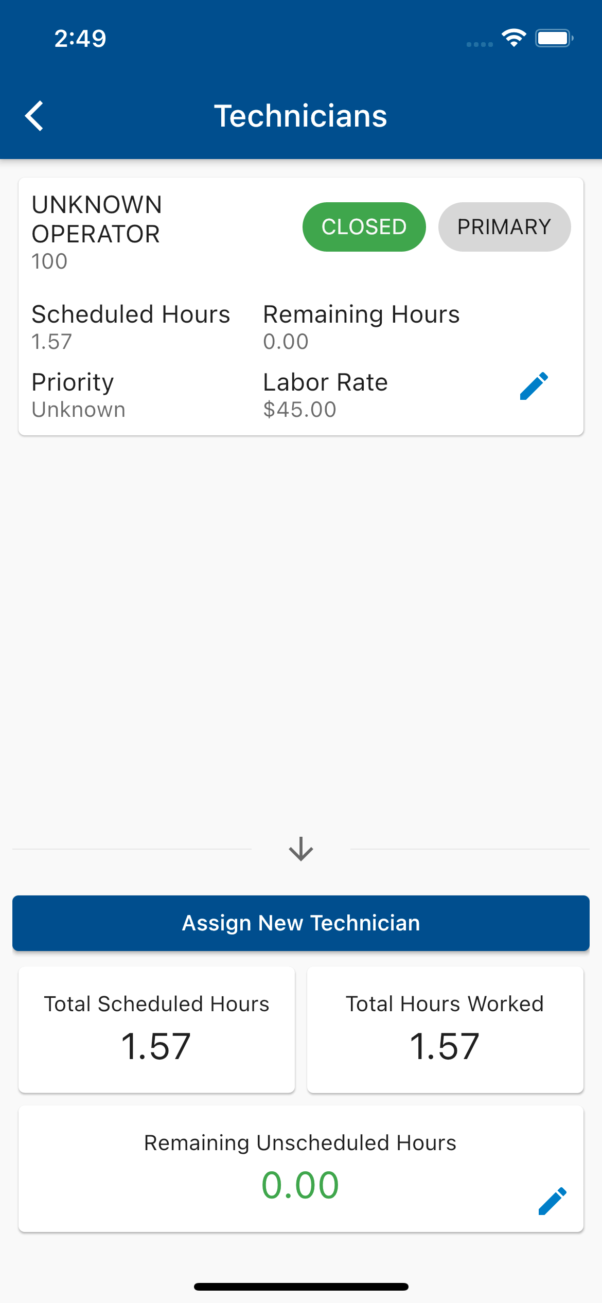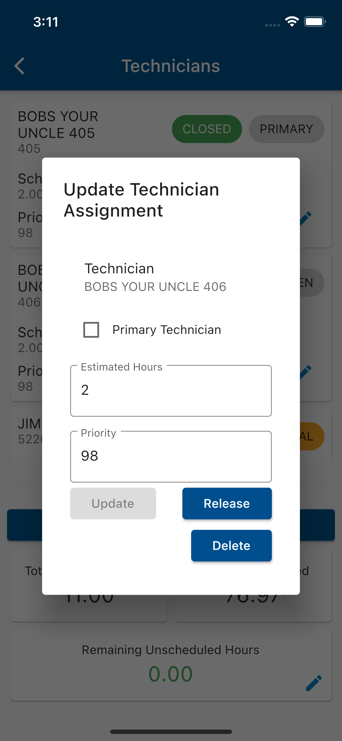 Releasing a mechanic is accomplished by tapping the pencil icon on the technician card. From here, there is a “Release” button. Releasing a mechanic essentially means that any UNUSED time will be put BACK into the unscheduled time.