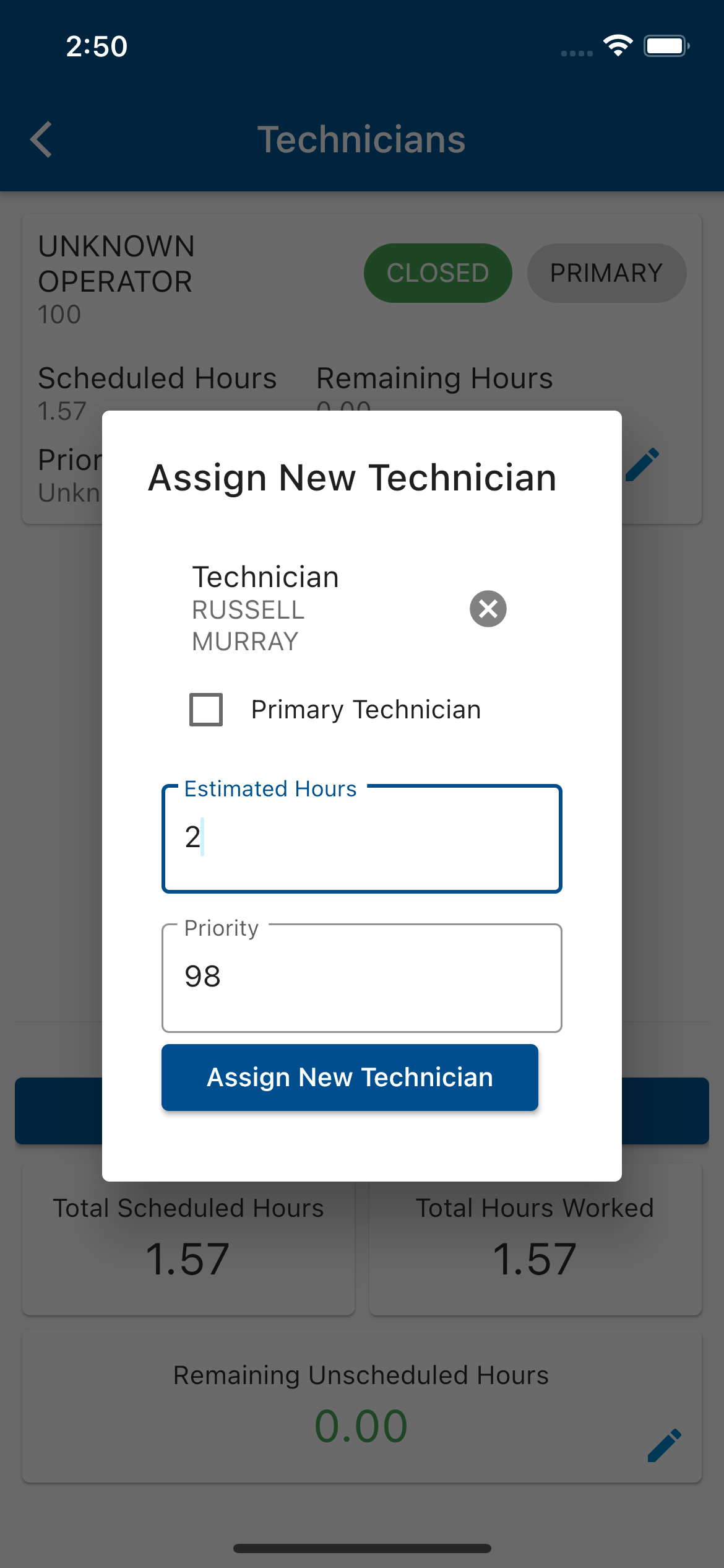 To assign a technician, tap the “Assign New Technician” button at the bottom of the screen. From here, fill out the form and tap “Assign New Technician”. That job will now show up on that technician’s job list!