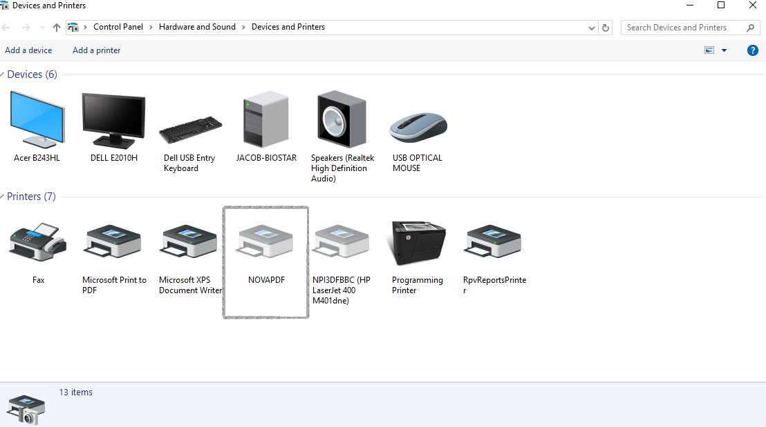 Delete the current NovaPDF printer located in "Devices and Printers"