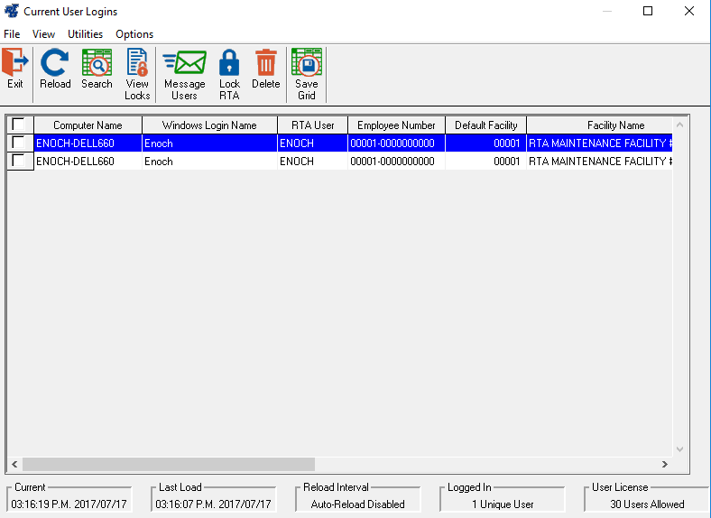 There are many times when it is helpful to see who is in the system: you have a locked file, you need to run an update of the system, you need to rebuild a file etc. Before you needed to go through the office, make some calls and tell everyone to get out. Sometimes people leave the screen up or don't answer. Now we have the ability to see who is accessing RTA and where they are in the system. However, this is a view only screen and you can not kick people out from here.