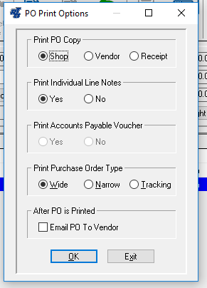 RTA has added to the PO and the PO approvals process the ability to send via email a PDF of the RPV/Crystal/standard printout of the PO. The print type is determined by the setting in SSM #12. This feature will also interact with the PO approvals by considering if the PO needs approval, if it does the email button will not be available. The email option will be available in three areas: 1) In the heading of the PO master screen there is a button. 2) In the print process a check box has been added to the other print options. 3) In the PO Approvals screen there is a button that will be active after the PO is approved. The PO Print popup has been updated to a common standard.