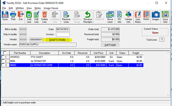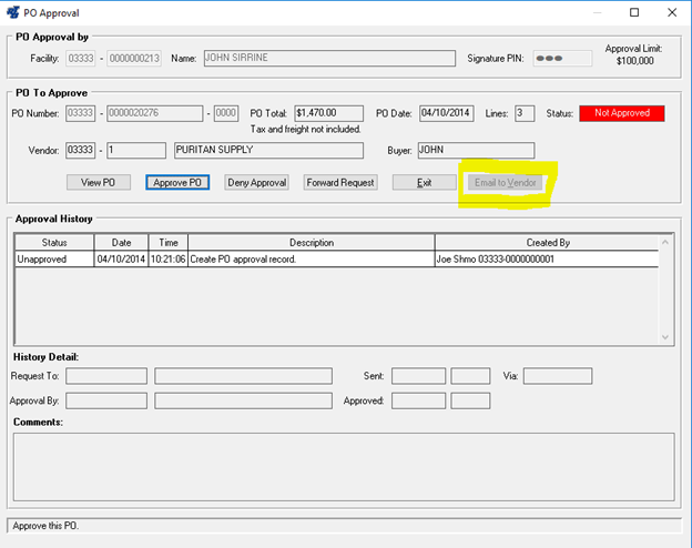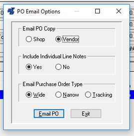 When activated, a send email will pop up with the Vendors email address, a subject line, the attached PO and a note in the body.