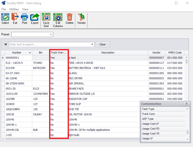 New Warranty Column added to Master Parts F1 lookup List (SQL)(7.2.6.17)
