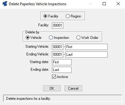 We have added a new purge option in RTA. You can now purge old paperless inspections just like you can purge WO's. To use this new purge, you can go to the drop down System > Purge > Delete Work Orders > Paperless Inspections. You will then be required to enter in at least a level 2 password. You can then fill in your parameters for what vehicles and/or date range you want to purge.