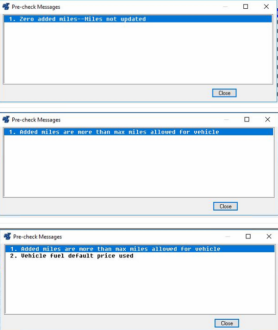 If you choose to do the pre-check, when it loads the Fueling transactions, it will now show a new 'Pre-Check' column. Any unprocessed transactions that would receive a message during processing, will have an option icon you can select to see the message. You can check the message and make any needed changes before processing.