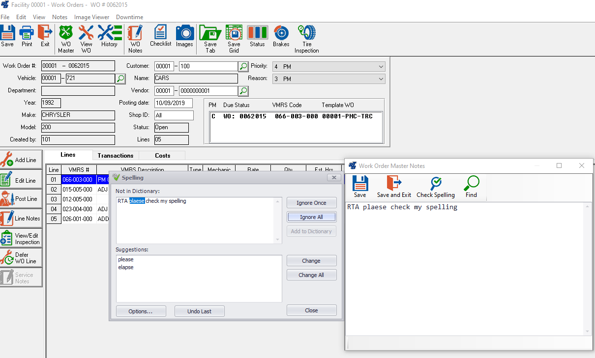 RTA has added the ability to spell check your notes. We have slowly released this feature in areas like the Master Parts File and in the Master Vehicle file. In 7.2.7 we have added the feature to all work order and line notes. This works in paperless shop and through the main RTA program. For more info, please see Spell Check
