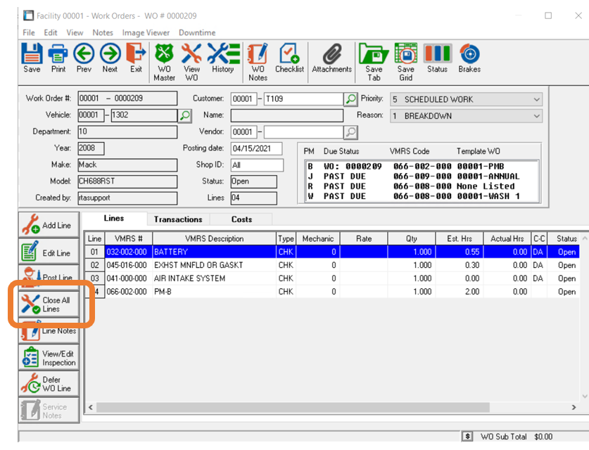 The “Close All Lines” button has been added to the Work Orders screen in order to better streamline the process of closing work order with multiple open lines. When a work order is complete, follow these steps to close all lines at once: