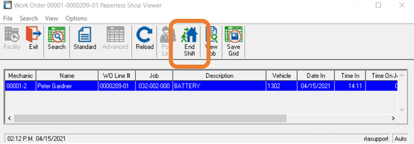 Double-Click on the Fail launch-option. Select the line the mechanic is clocked into the the Paperless Shop Viewer and select “End Shift”, clocking them off from the Close All Lines screen. Confirm the date and time.