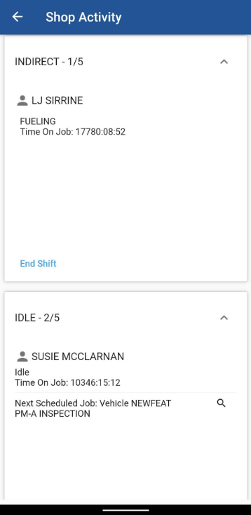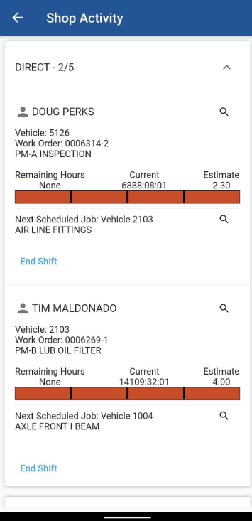 This Activity Screen will identify the activity option, such as “DIRECT”, then list the Employees connected to that activity currently, along with the job, time frame (compared to Estimated Time from the VMRS file) and the next assigned job, according to priority they’re expected to do.