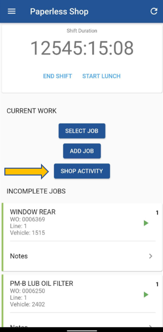 To bring up the new Activity Screen, open RTA Mobile on your device and go to Paperless Shop > Shop Activity