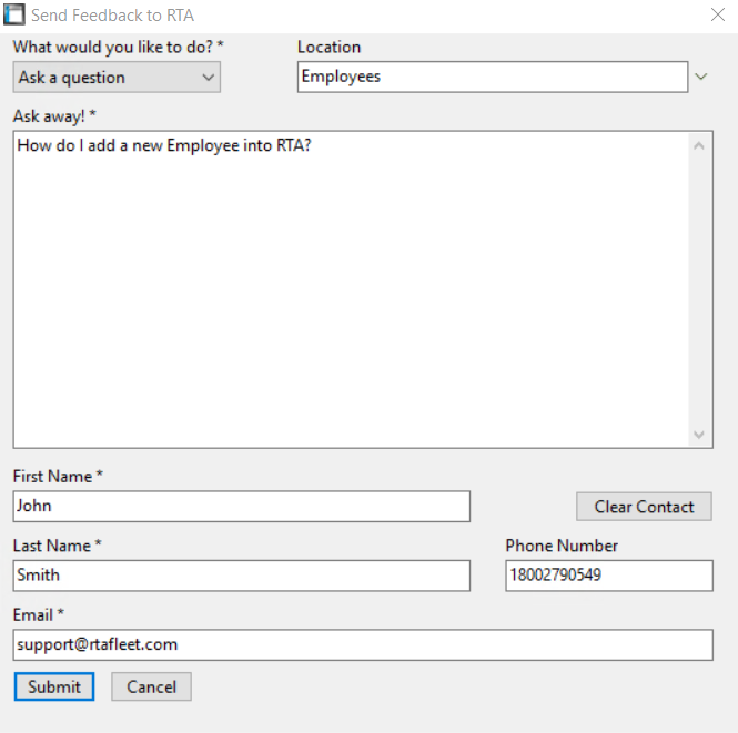 Users should use this tool to Ask a Question, Report a Problem or Request a Feature in RTA.