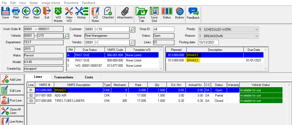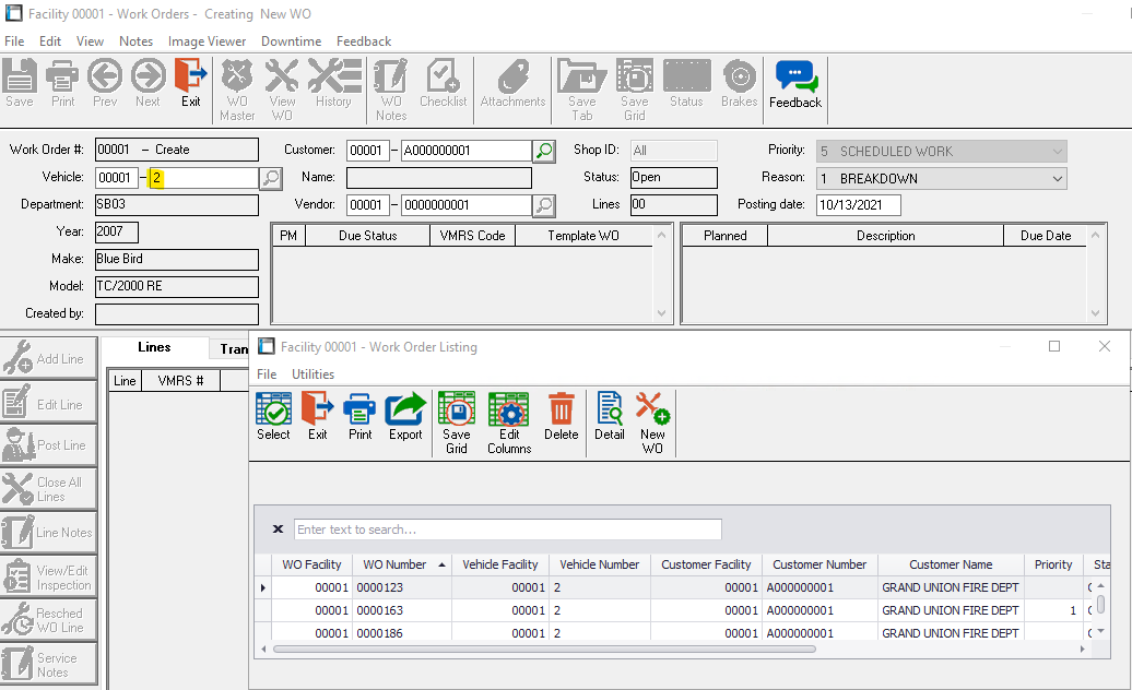 When a vehicle is selected within the Work Order screen, if there are Planned Jobs existing for this vehicle, a Planned Work prompt will launch allowing the user to include any deferred or planned jobs on this new work order. The Work Order main screen will also allow a user to double-click in the Planned Work data-box to auto-add the job as a Work Order Line.