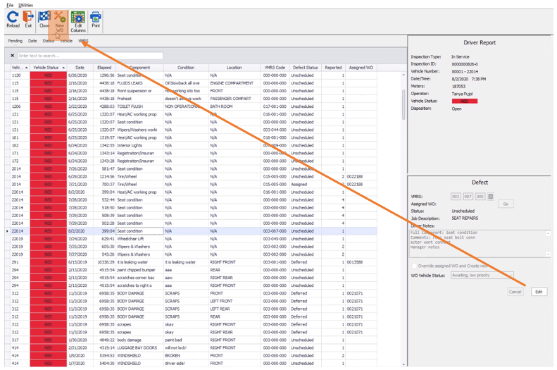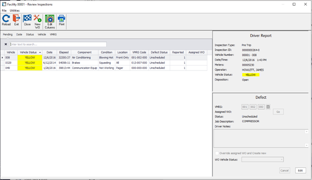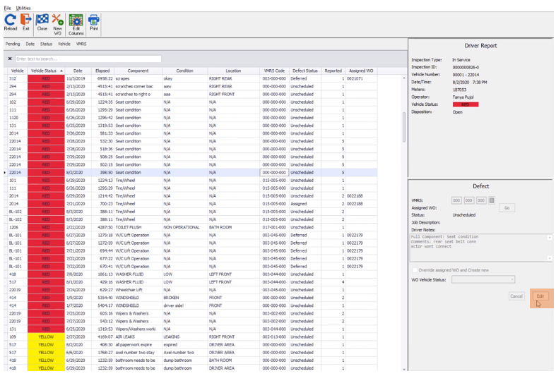 With the proper line selected, you can use the “Defect” view to establish a VMRS code (F1 lookup list enabled) and add/edit any notes placed on the original Driver Report. After selecting the line, simply click Edit in the Defect box and input the needed data. From here you can also assign the Work Order vehicle status.