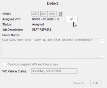 When a work order is assigned, you can actually view/edit/close it from the Driver Reports screen if desired. The Work Order details will be added to the Defect screen with the option Go next to it. If you click on Go, you’ll be brought to the Work Order screen to post, edit, view and even close the Work Order as normal. Exiting back from the Work Order will bring you back to the Driver Reports screen.