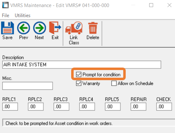 In the VMRS code master file, there is an option to request the Vehicle Condition when closing a work order line. This is the same for the new Close All Lines button. If a VMRS file is checked, then is assigned on a work order line, the Close All Lines prompt will appear, requesting the condition at the time of the work order’s close. Select it using the provided drop-down list.
