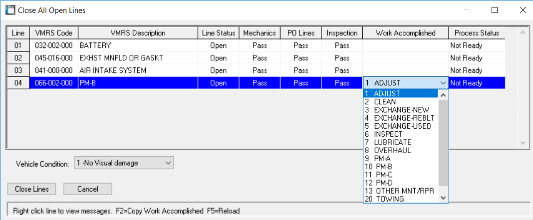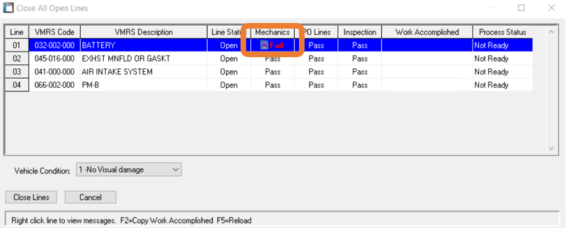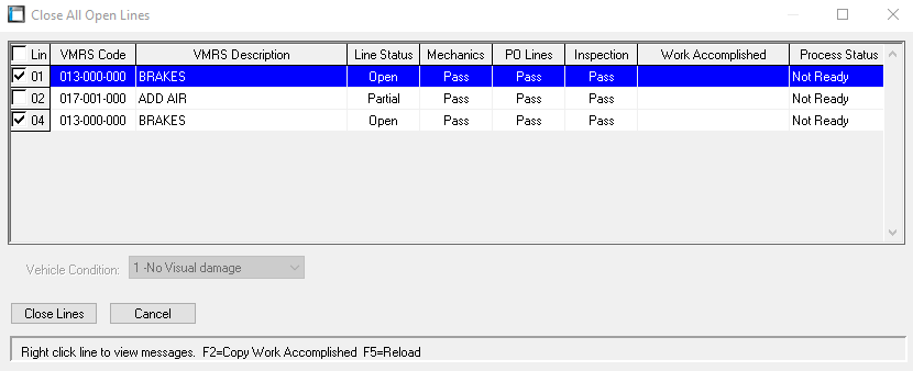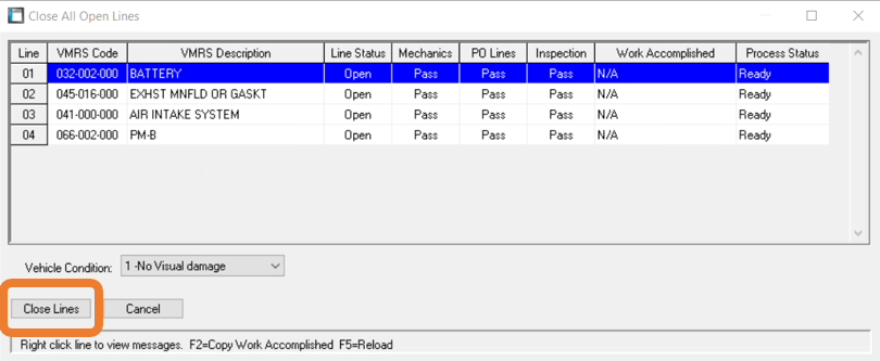 With all categories showing as “Pass”, the Work Accomplished (if desired) category completed, the Vehicle Condition (if desired) set and the Process Status showing all as “Ready”, the user can now Close Lines.