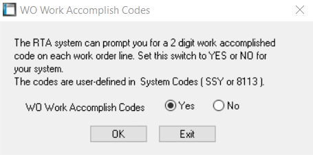 When using the Close All Lines button, you have the option to set a Work Accomplished Code. With System Switch Main#40, you can enable this feature, forcing an accomplishment code before a work order line can be closed in this process.
