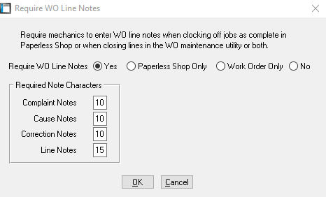 SSM Misc1# 50 - Require Mechanics to enter WO line notes when closing off jobs as complete in Paperless Shop, or when closing lines in the WO maintenance utility – or both.