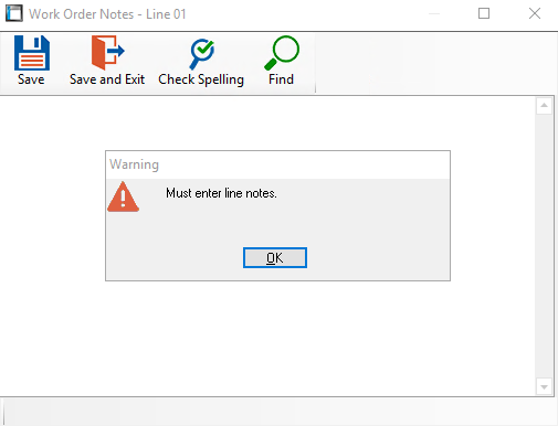 When the switch is set to “Yes,” if a work order line is attempted to be closed without notes, the error below will be prompted. The line will not close without the proper character amount of notes: