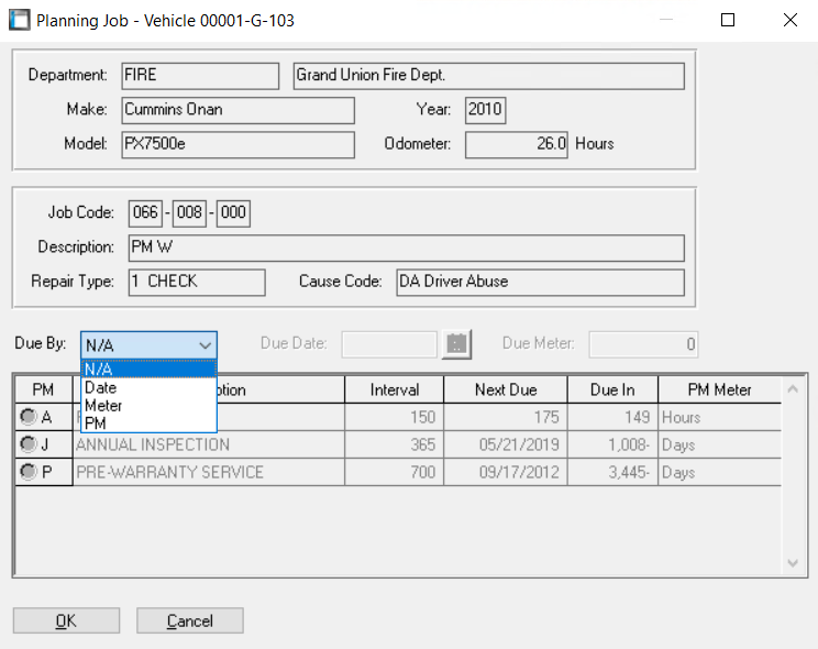 The purpose of the Due Date/Meter is to allow the ability to search and organize these planned jobs from the Planned Work report (WF). This overview can be run regularly by Shop Supervisors to determine work priority and plan/assign future jobs. The column header, “Due Date” can be applied to the report lookup as way to filter or organize the jobs: