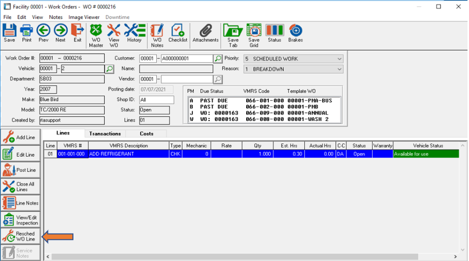 When a work order line is created, with all details attached, it will show on the work order screen. When a time comes that this work order line needs to be rescheduled or planned for a future date, the user can select “Resched WO Line”