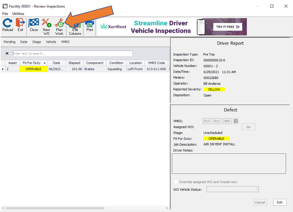 As driver reports are submitted in or through RTA (WDC), they can be found in the Review Driver Reports screen (WDD). Previously, the only options in this screen were to create a work order from the review line, or delete/close it. With the addition of Planned Work, users can now create work order line details on the review screen, but instead of converting the report into a work order line, they can place it automatically to the vehicle as a Planned Work line.