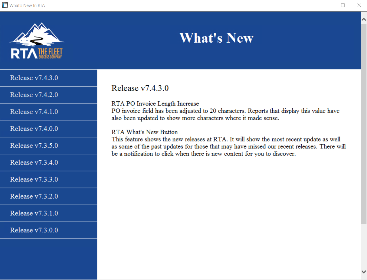 As of RTA 7.4.3, there is an RTA What’s New button to provide more information on new releases made within RTA. The icon shows as follows: