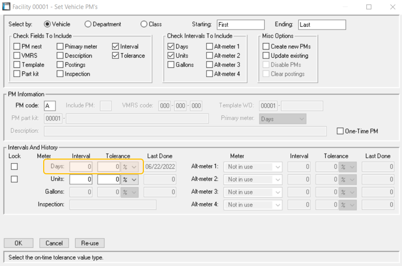 This same Tolerance can be applied to a vehicle set (by Vehicle group, Department or Class) through the Set PM Utility (SCPS). Select your vehicle group, enable the “Tolerance” field-to-include, as well as the Interval of your meter (days, miles, etc.). Then configure your Tolerance % or # and hit OK to apply to all vehicles within that group.